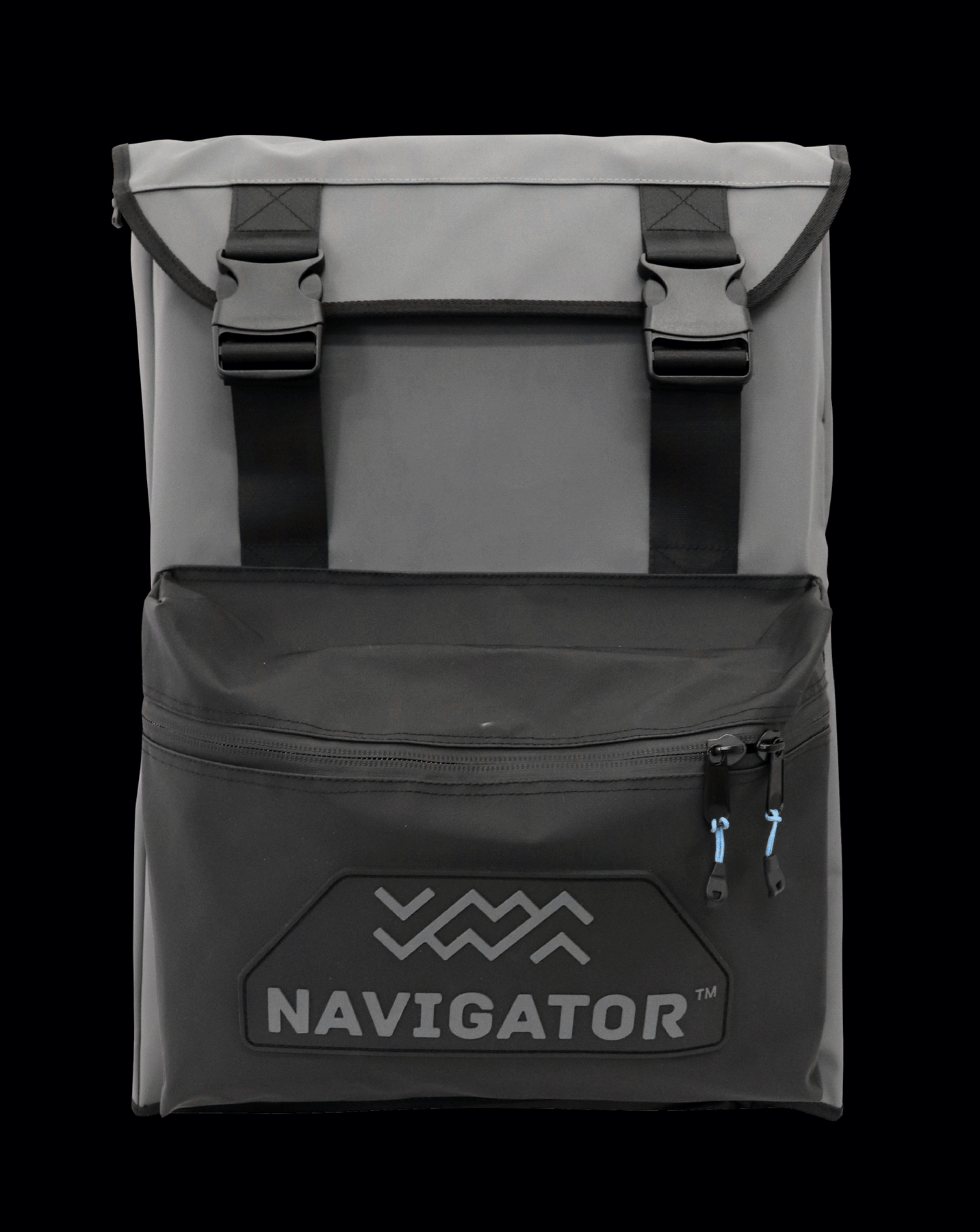 Front pocket features twin slider rubberized zipper and drainage hole