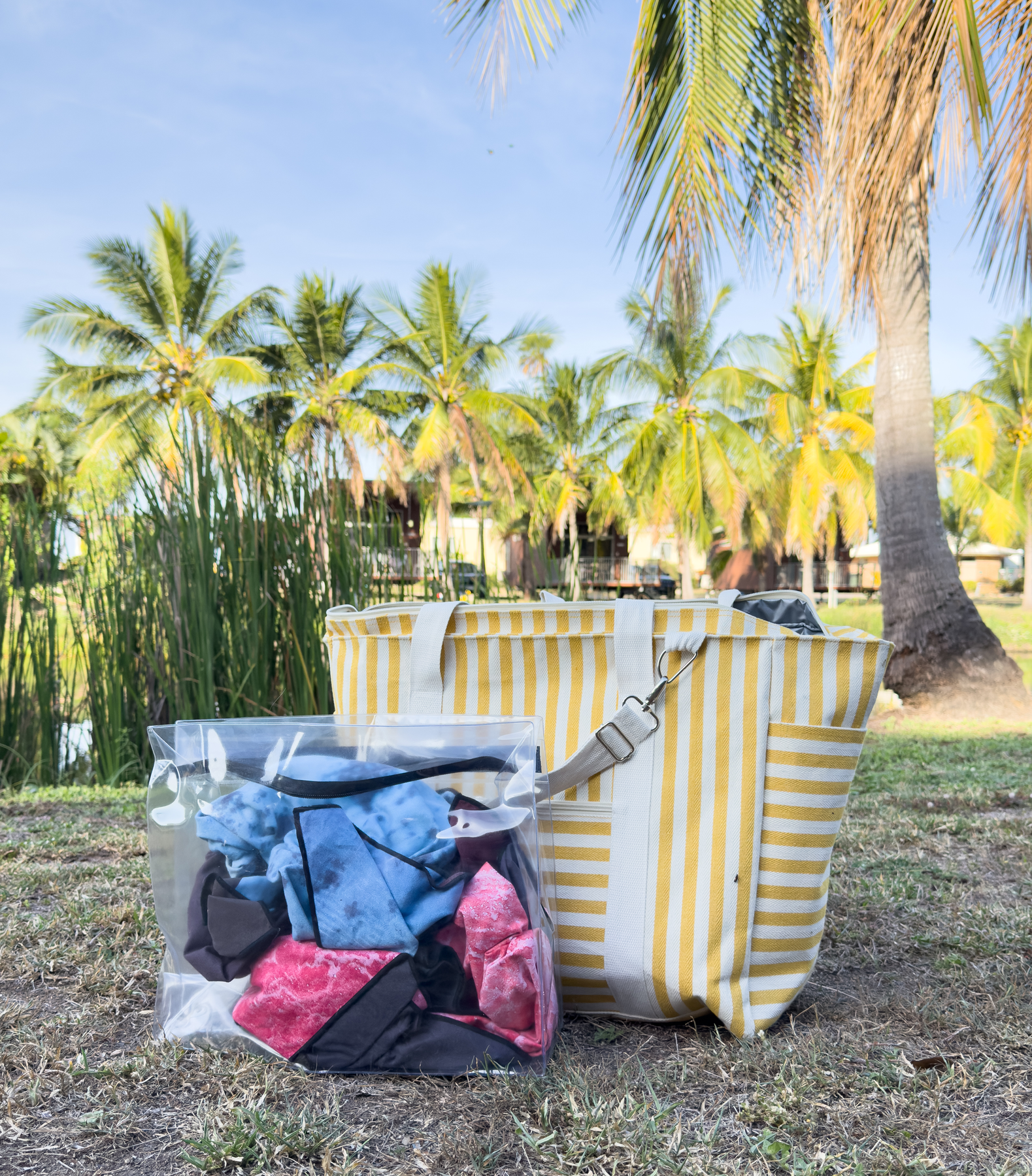 - Inside you will also find a larger REMOVABLE clear pouch to keep your wet towel and bathers separate from your dry clothes!