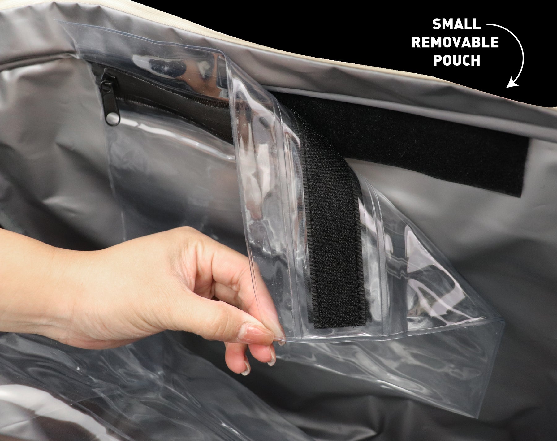 - Inside you will also find a larger REMOVABLE clear pouch to keep your wet towel and bathers separate from your dry clothes!